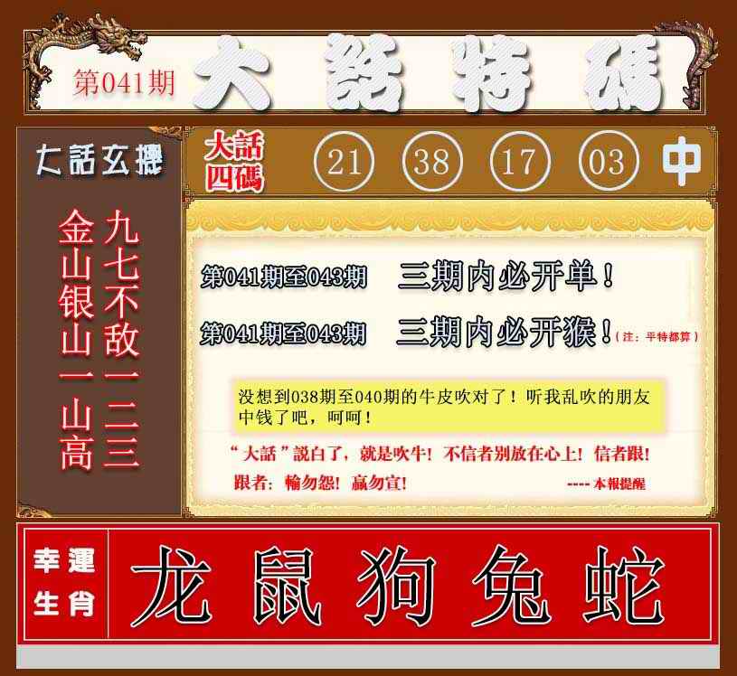 | 澳门私彩图纸 | 00900.com九龙王●●三肖四码 | 大三巴【三码致富】连续爆中 |